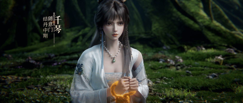 Qianqin’s character design is a highlight, with her asymmetrical outfit and delicate features stealing the spotlight. Her white dress, flowing yet practical, mirrors her dual nature as both a talented cultivator and a vulnerable figure. The attention to detail in her shoulder design adds a unique flair, setting her apart from other female characters, such as Li Muwan.